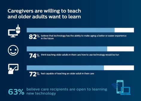 يجد ‎%75 من مقدمي الرعاية غير المحترفين أن تعليم الكبار في السن كيفية استخدام التكنولوجيا قد يكون أمرًا ممتعًا، بينما يعبّر ‎%66 من متلقي الرعاية عن استعدادهم لتعلم التكنولوجيا.